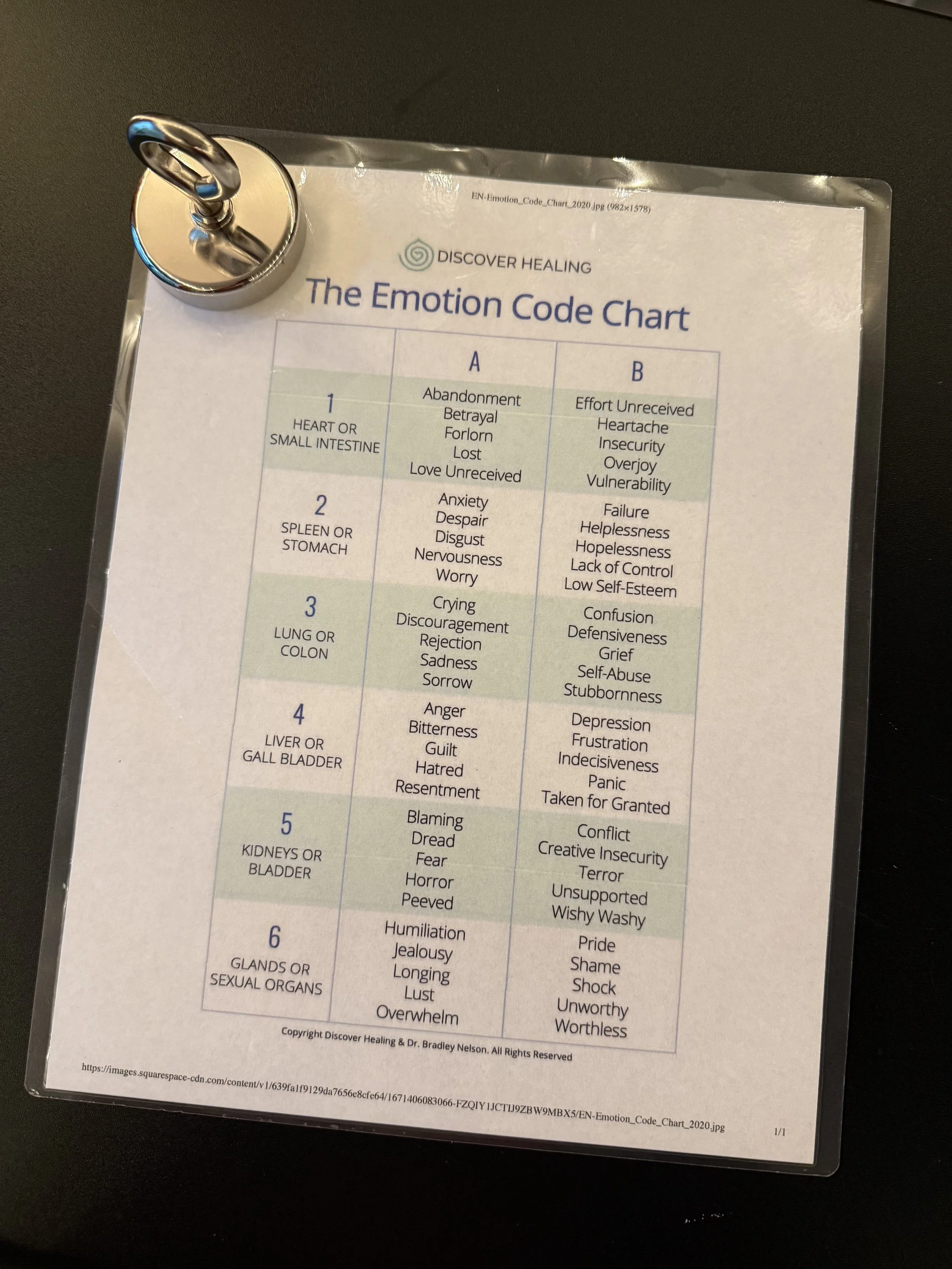 Emotion Code is an energy healing technique created by Dr. Bradley Nelson. It aims to identify and release "trapped emotions"—negative emotional energies from past experiences that can get stuck in the body. By using muscle testing to pinpoint these emotions and then releasing them with a magnet. The goal is to alleviate physical and emotional issues, promoting a greater sense of well-being.